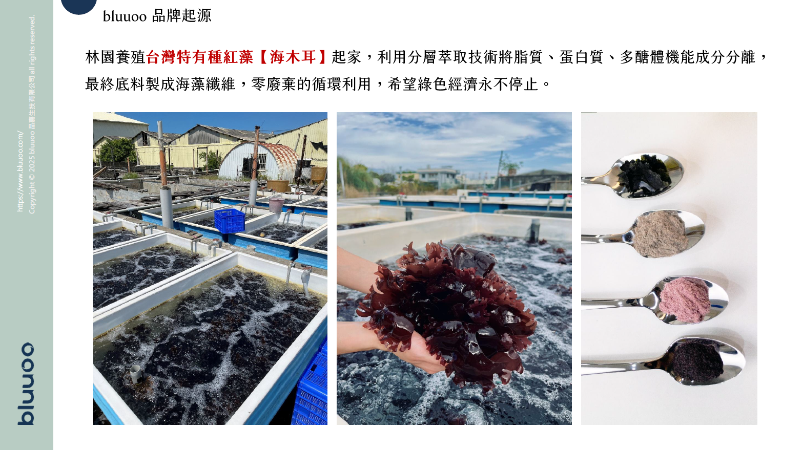 Graduates from the National Taiwan Ocean University, they have an unbreakable bond with the sea. They are working tirelessly to unlock the value of marine algae, from cultivating and extracting Taiwan’s native red algae species to developing creative culinary applications. bluuoo is undoubtedly a young and remarkable new brand to watch.