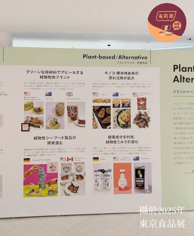2025年雀莉家團隊親自拜訪東京食品展,蔬食就是團隊們手上研究的主題之一,植物性食品(以植物來源原料製成的食品)在全球市場持續擴大,成長的驅動不只是宗教,更來自大眾對飲食控制與環境的重視、蛋白質來源的多樣化等意識而有所發展。蔬食食品,台灣自是不陌生,大家常見的豆乾、豆皮或素料等,多是從黃豆原料而來,但現今蔬食的原料,涵蓋更多開發應用,如超級食物藜麥、地中海飲食的鷹嘴豆、植物性Omega-3的核桃、超級能量的藻類...等,讓蔬食有更豐富多樣均衡營養的可能性。