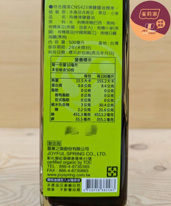 喜樂之泉有機薄鹽醬油,合適於對鈉有控制需求的家人朋友,其鈉含量4,513.2mg/100g,約是市售常見醬油的80%~85%,提供建置家庭營養管控上的資訊參考。