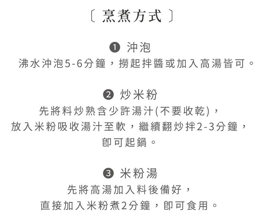而且純米製成非常容易消化,吃完後比較不易產生腸胃的不適感。烹調方式也非常方便,不用事先浸泡,所以相當快速好煮,可以直接用沸水沖泡5~6分鐘後撈起拌醬或加入高湯,或者炒米粉、米粉湯,都非常適合。