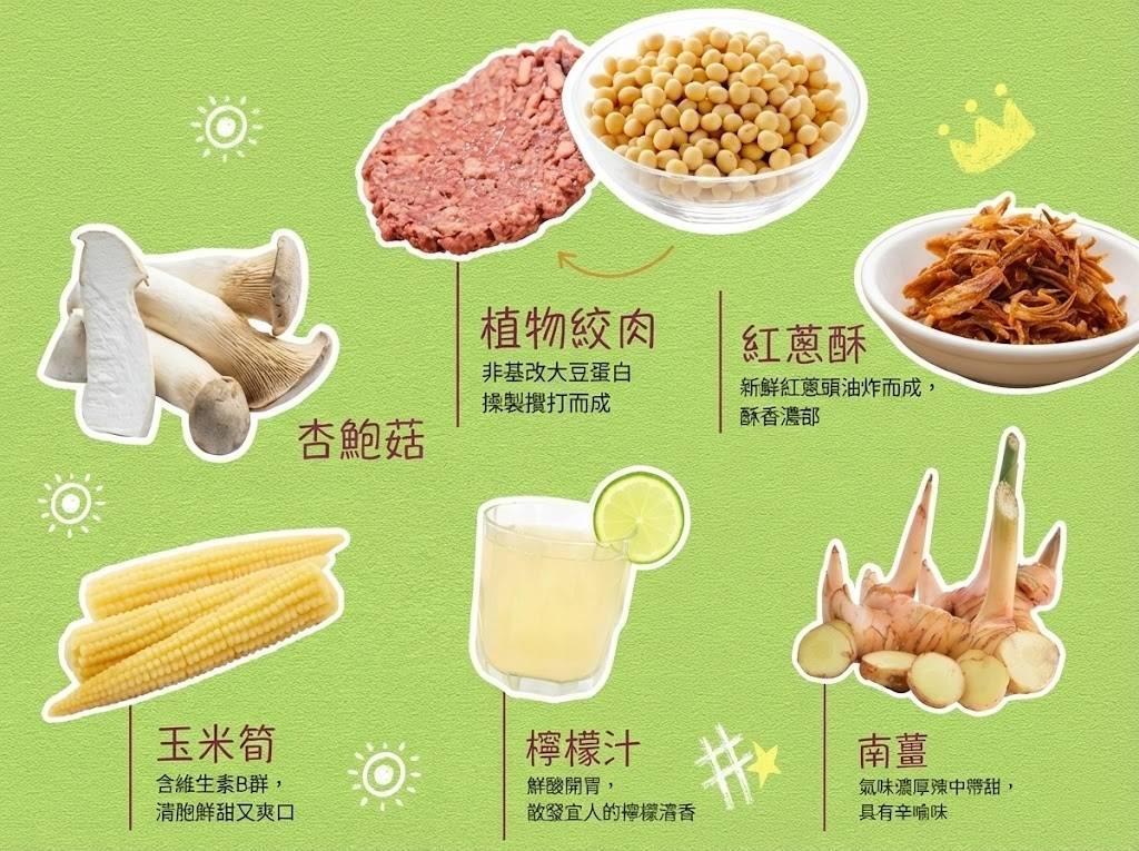 以非基因改造大豆蛋白植物肉取代傳統豬肉製成,特製香辛料熬煮出清爽酸甜泰式風味,再加入杏鮑菇丁、玉米筍、洋蔥丁、豌豆、紅黃椒及酸甜小蕃茄,層層堆疊出清爽咀嚼口感,一吃就開胃。