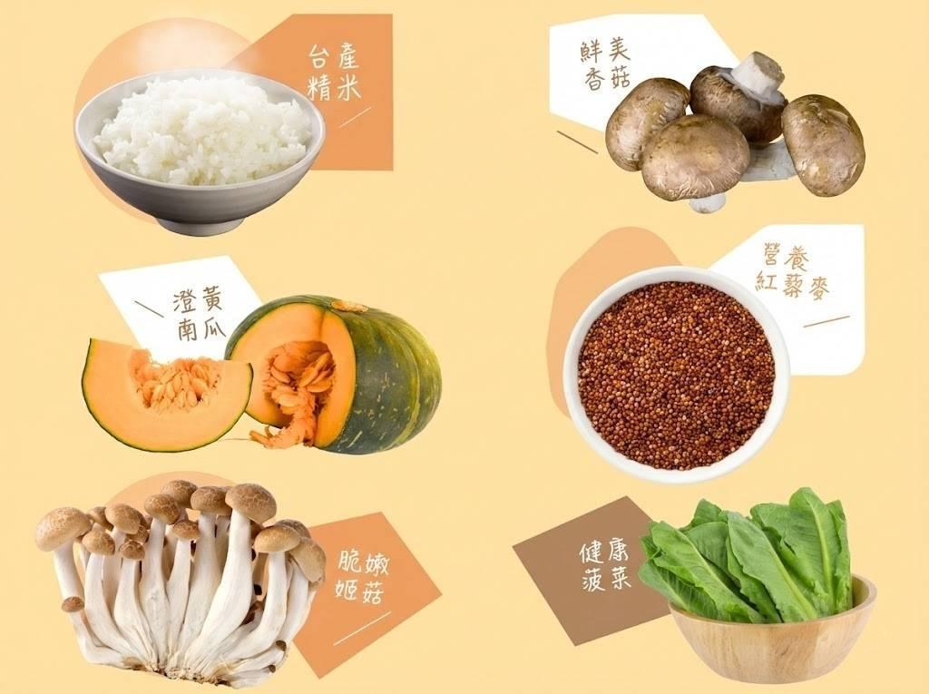 採用台產本土米以及被譽為超級穀物的「紅藜麥」為基底,加入南瓜一同熬煮,整碗充盈南瓜香甜,添加姬菇、乾香菇增添風味,加以鮮翠菠菜補充營養,另外還有小巧南瓜丁,每一口都是鮮甜好滋味。