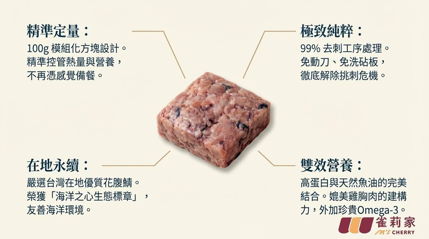 營養攝取不夠均衡,這已然成為我們餐桌飲食管理的重要課題。為什麼呢? 隨著我們年齡的增長,我們食量會自然下降,當每一餐量下降,我們吃進肚裡的一口一食,其所乘載的營養密度若能愈高,日常的飲食管理自然就愈加游刃有餘。這正是雀莉家開發這款「台灣花腹鯖絞肉」的起心動念。