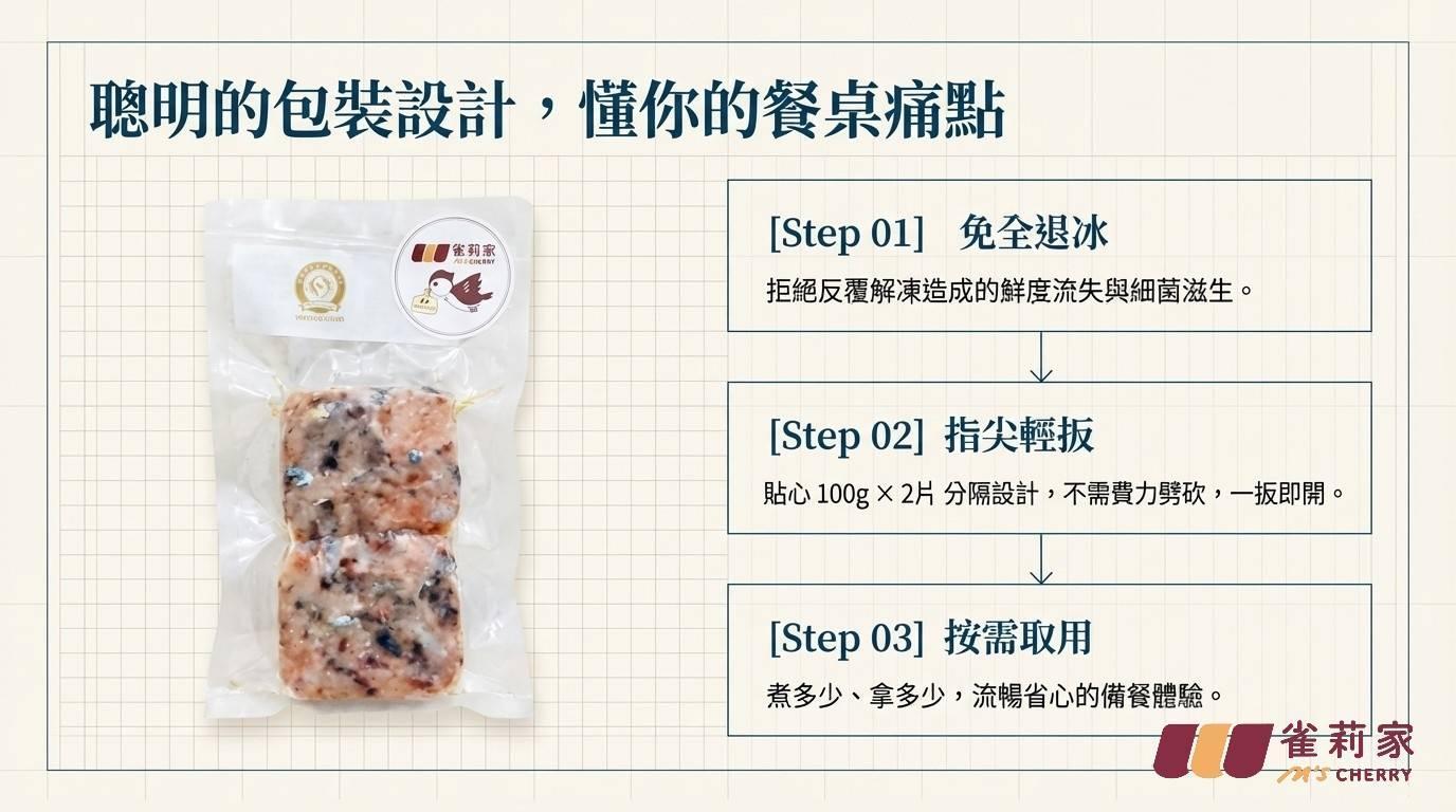 我們在包裝設計上融入了巧思。每一包內有200g的花鯖絞肉,貼心設計成100g*2片入的規格。這樣的份量不僅方便大家精準計算每一餐的營養價值,更能按需取用。一次料理剛好使用一塊,不需要費力解凍整包,只需輕輕用手指一扳就能輕鬆分開,取用過程流暢又省心。