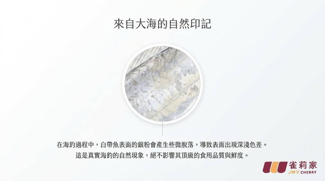 海釣白帶魚過程,白帶魚表面的銀粉會些微脫落,因此表面會有深淺色差,屬於正常現象唷,不影響食用品質。