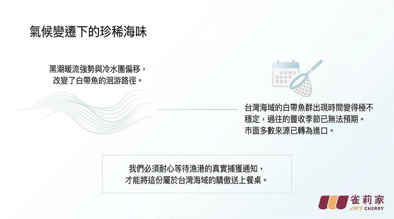 市面上白帶魚來源眾多,多數是進口,而台灣海域的白帶魚在市場愈來愈少見,受氣候變遷影響,白帶魚對水溫極為敏感,近年來黑潮暖流強勢或冷水團南下位置偏移,改變了白帶魚的洄游路徑,導致台灣海域的魚群出現時間變得不穩定。我們經常要等待漁港通知真的捕獲了,才進入商品開發,過往出海豐收的季節,都未必能如預期收穫。